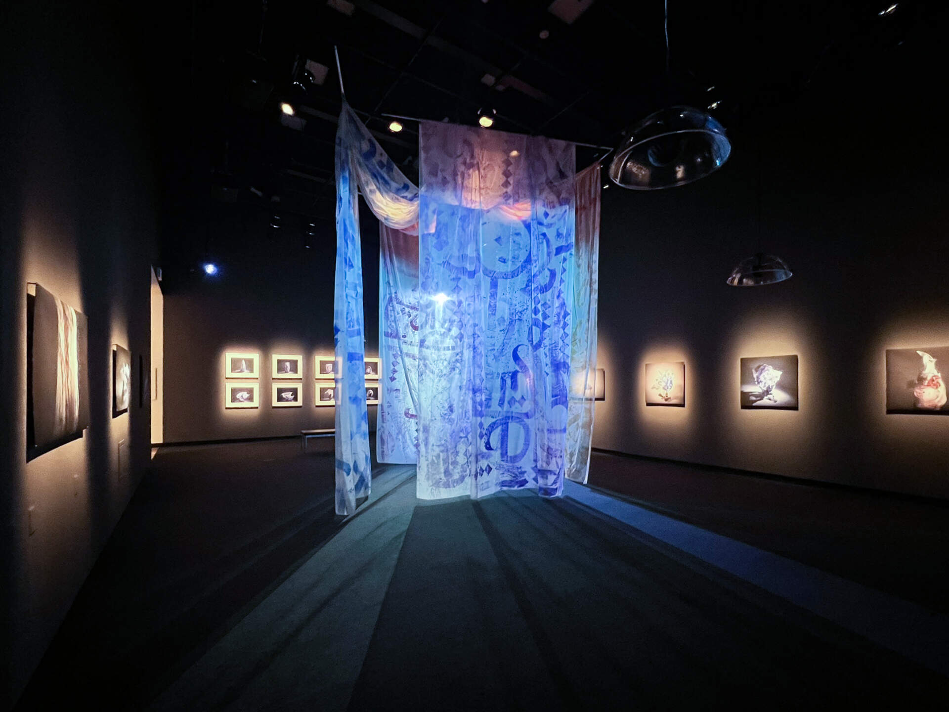 The Language Within Us is an invitation to join in a collective journey that explores the mysteries of human communication and identity through language. As you step into the central space created by the hanging fabrics, the ethereal light filters through the translucent fabric painting, casting an otherworldly glow that draws you in. Outside of the enclosure, the viewers witness the beauty of the interplay between the fabric, video movement, and light.